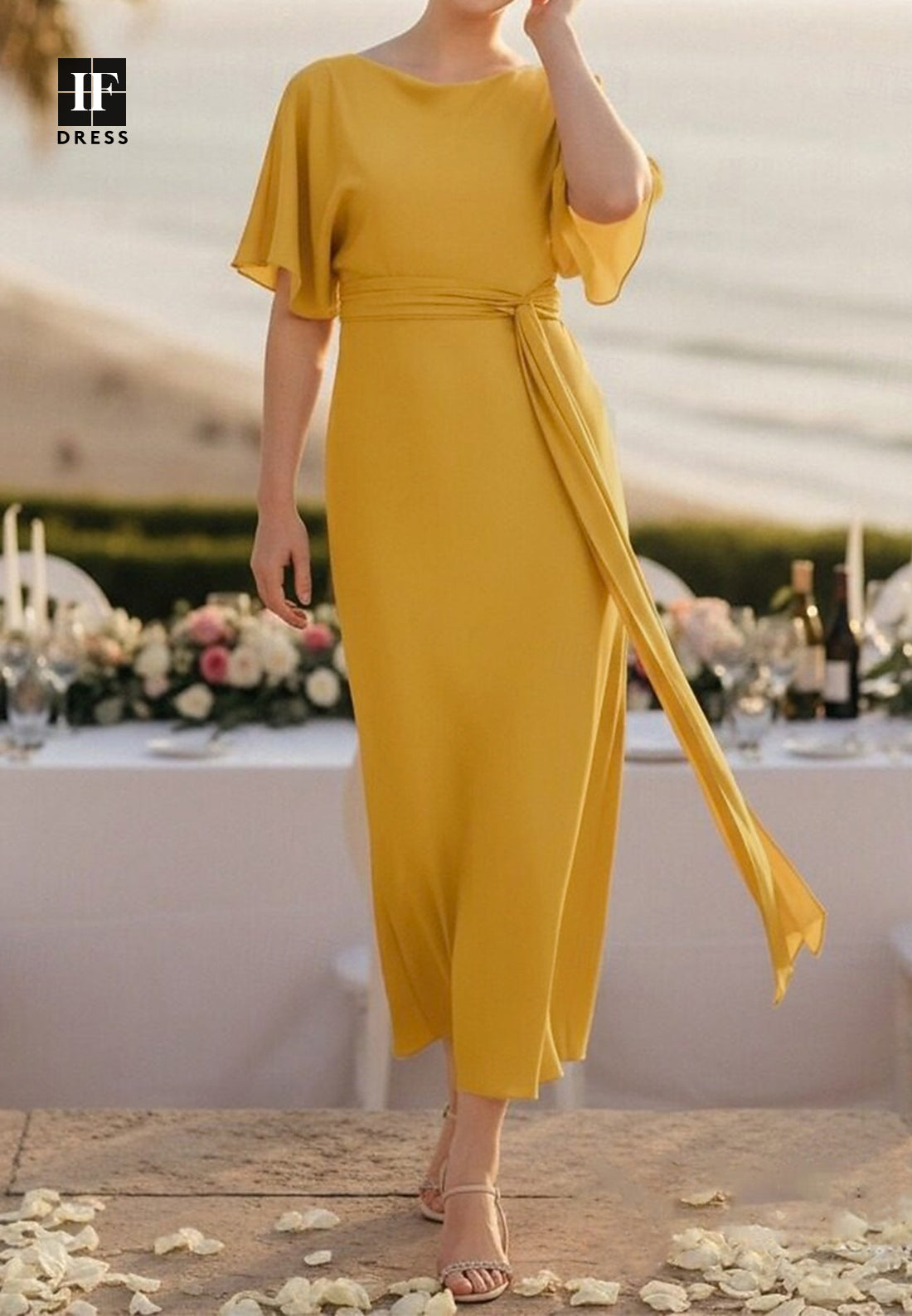 This refined mother of the bride dress combines classic elegance with practical sophistication. The scoop neckline offers a flattering, feminine frame, while short sleeves provide comfortable coverage without sacrificing style. Crafted from flowing chiffon, the gown features graceful pleating that adds texture and movement throughout. The mermaid silhouette creates a streamlined, flattering fit that transitions smoothly to an ankle-length hem, offering a modern take on traditional formal wear. This dress is perfect for mothers who prefer a slightly shorter length while maintaining the polished, elegant aesthetic essential for celebrating their child's wedding day.