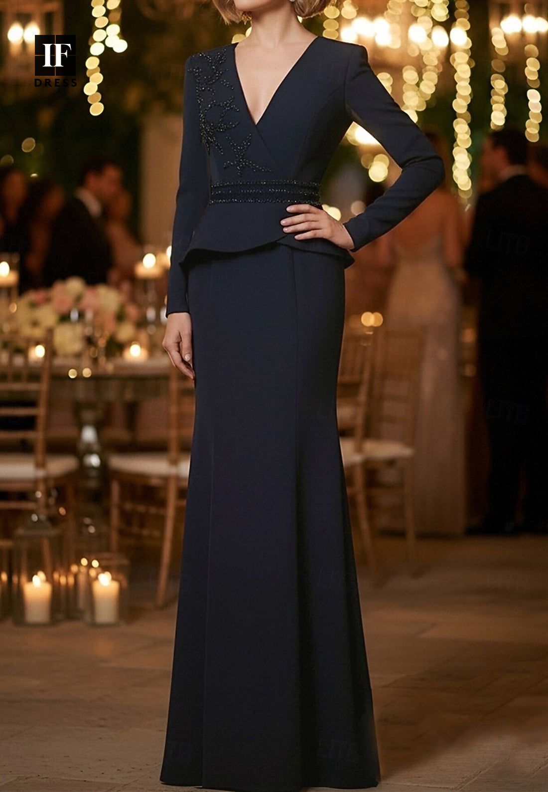 Command the room as mother of the bride in this stunning mermaid gown that exudes timeless glamour. The flattering V-neckline draws attention upward while sleeveless styling showcases elegant shoulders and arms. Luxurious satin hugs your curves beautifully, with intricate rhinestone detailing that sparkles with every movement, adding an element of refined luxury. The floor-length mermaid silhouette creates a dramatic, show-stopping effect that celebrates your presence without competing with the bride. This dress perfectly balances sophistication with showstopping elegance, ensuring you feel confident, radiant, and absolutely unforgettable.