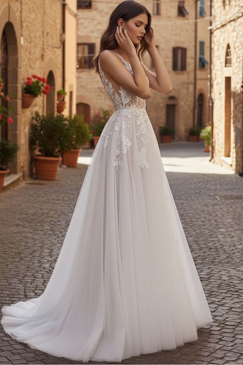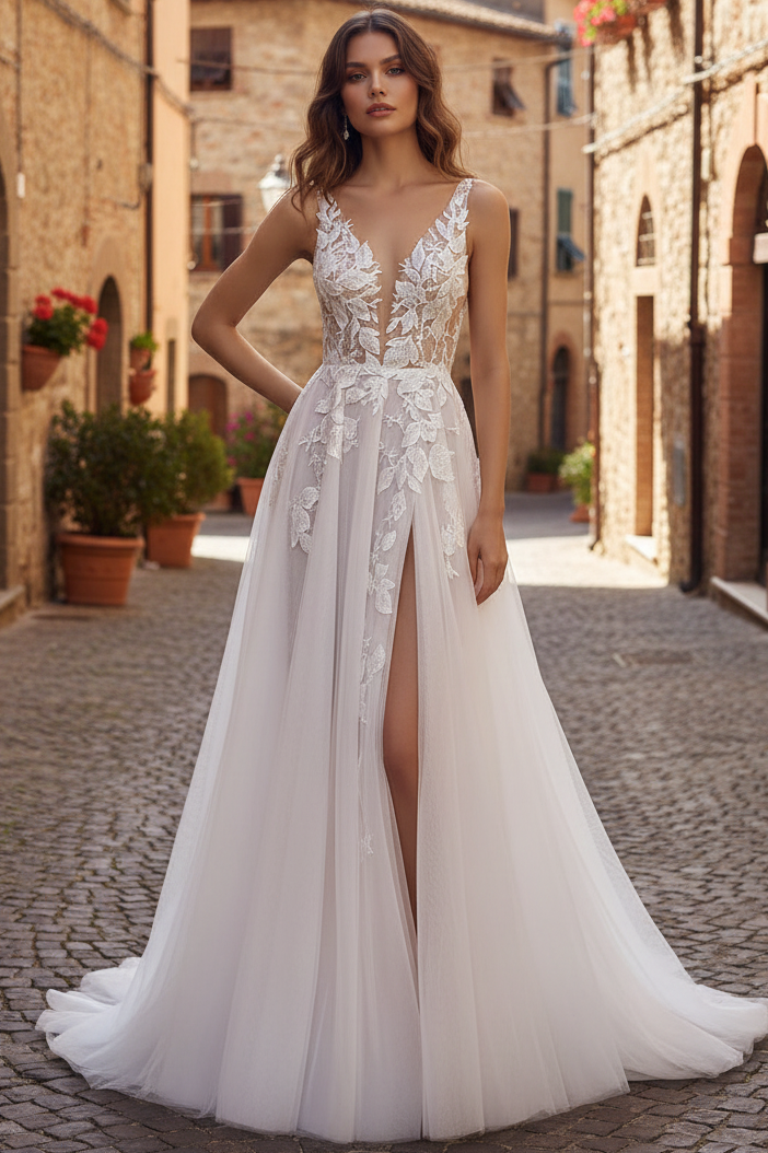Walk down the aisle in effortless elegance with this A-line beach wedding dress. The deep V-neckline and delicate straps create a flattering silhouette, while intricate lace appliqués adorning the tulle fabric add romantic dimension. A graceful slit provides ease of movement without compromising sophistication. Designed for the modern bride seeking understated luxury, this sleeveless gown captures the relaxed refinement of destination weddings while maintaining timeless bridal appeal.