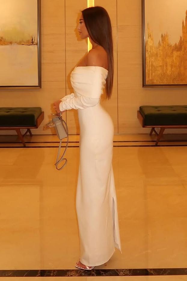 Elevate your evening elegance with this sophisticated mermaid gown. Crafted from luxurious satin, the dress features a romantic sweetheart neckline and graceful off-shoulder long sleeves that frame the shoulders beautifully. Intricate pleating details add dimension and movement throughout the silhouette, while the floor-length cut ensures a dramatic, show-stopping presence. The fitted mermaid design flatters the figure before flowing into an elegant train, making it an ideal choice for formal galas, black-tie events, and special occasions where refined glamour is essential.