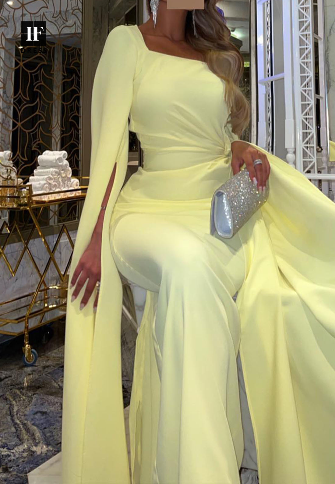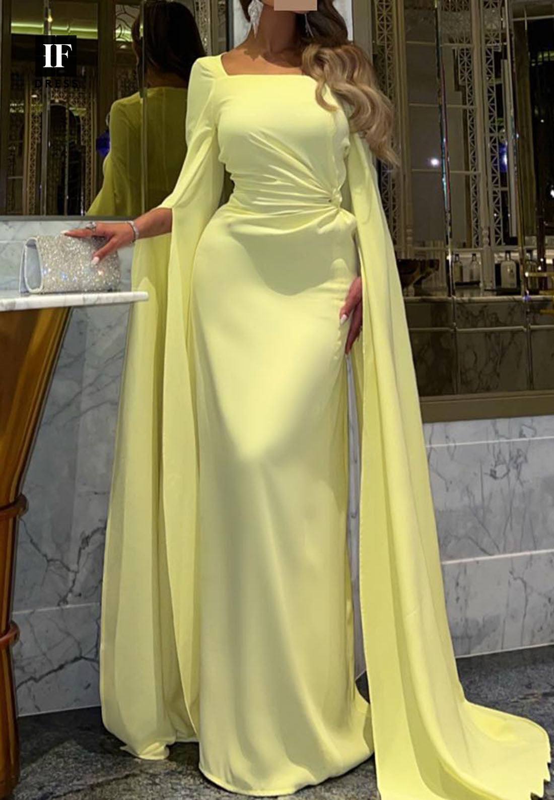 Expertly crafted and designed, this Square-Neck Cape-Sleeves Mermaid Evening Dress is sure to make a statement. Made with high-quality chiffon, the floor-length design and pleated detailing offer a sleek and elegant look. Perfect for formal occasions, this dress exudes confidence and sophistication.