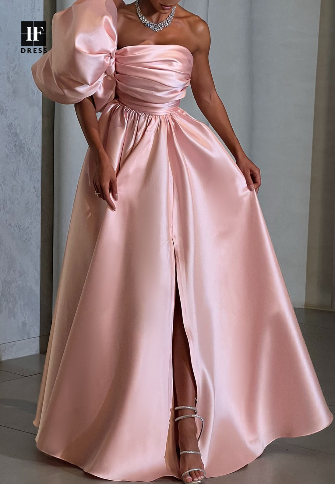 Expertly crafted with satin fabric, our Tube Top Off-Shoulder Sleeveless Dress boasts a sleek silhouette with delicate pleats and a flattering A-Line cut. Perfect for formal events, the dress features an off-shoulder design and a sultry thigh-high slit for a touch of glamour. Elevate your style with our floor-length evening dress.